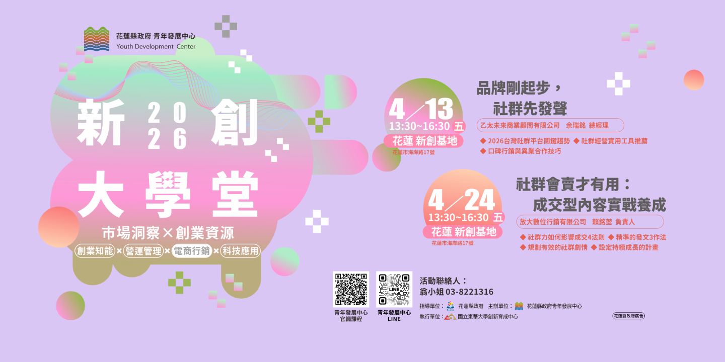 ☺ 講師乙太未來商業顧問有限公司 余瑞銘總經理☼ 開課時間4/13(一)13:30-16:30𖡡 上課地點花蓮新創基地(花蓮市海岸路17號)⏲︎ 報名期間20