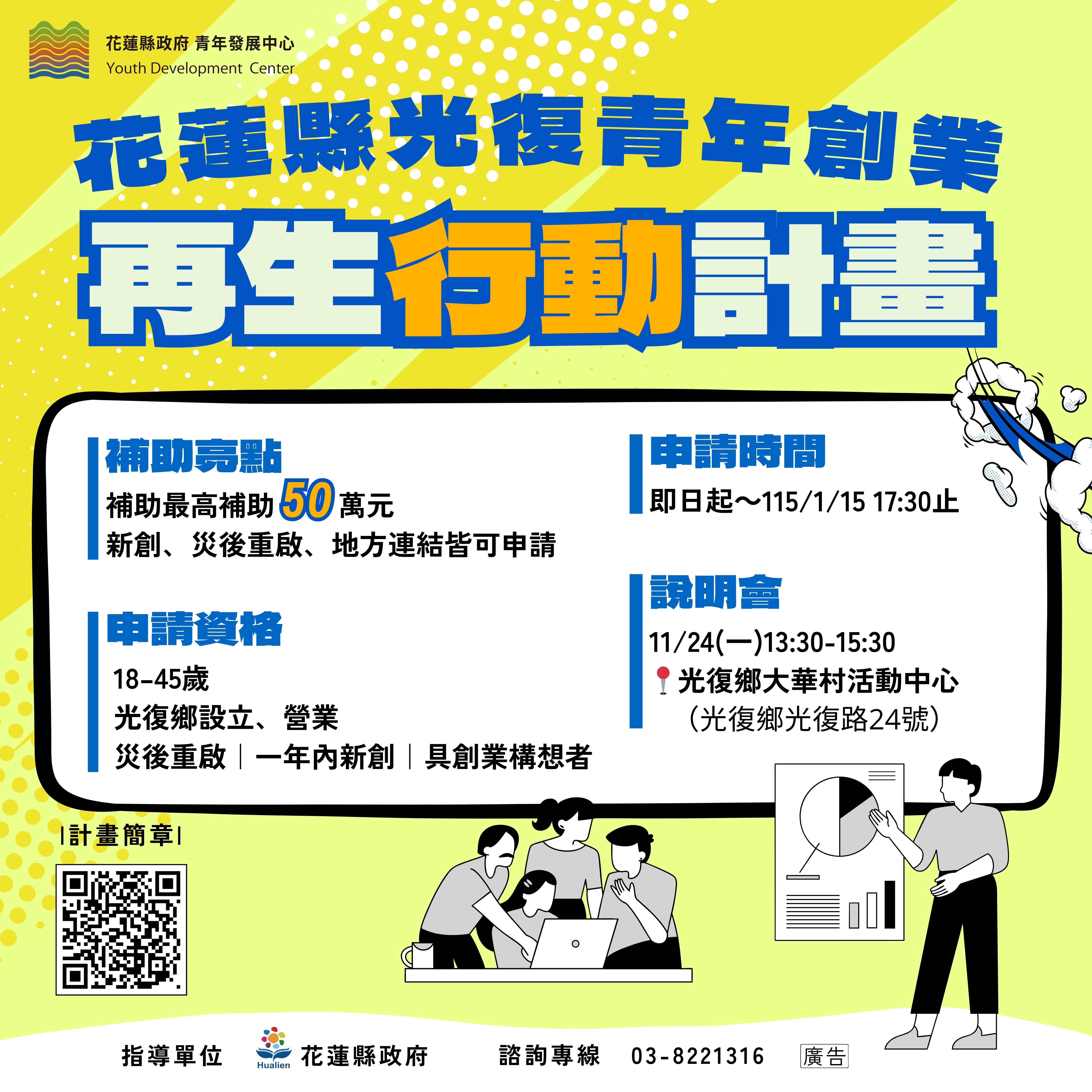 花蓮縣推動「光復青年創業再生行動計畫」 11/24辦理說明會暨提案撰寫工作坊 協助青年災後再出發